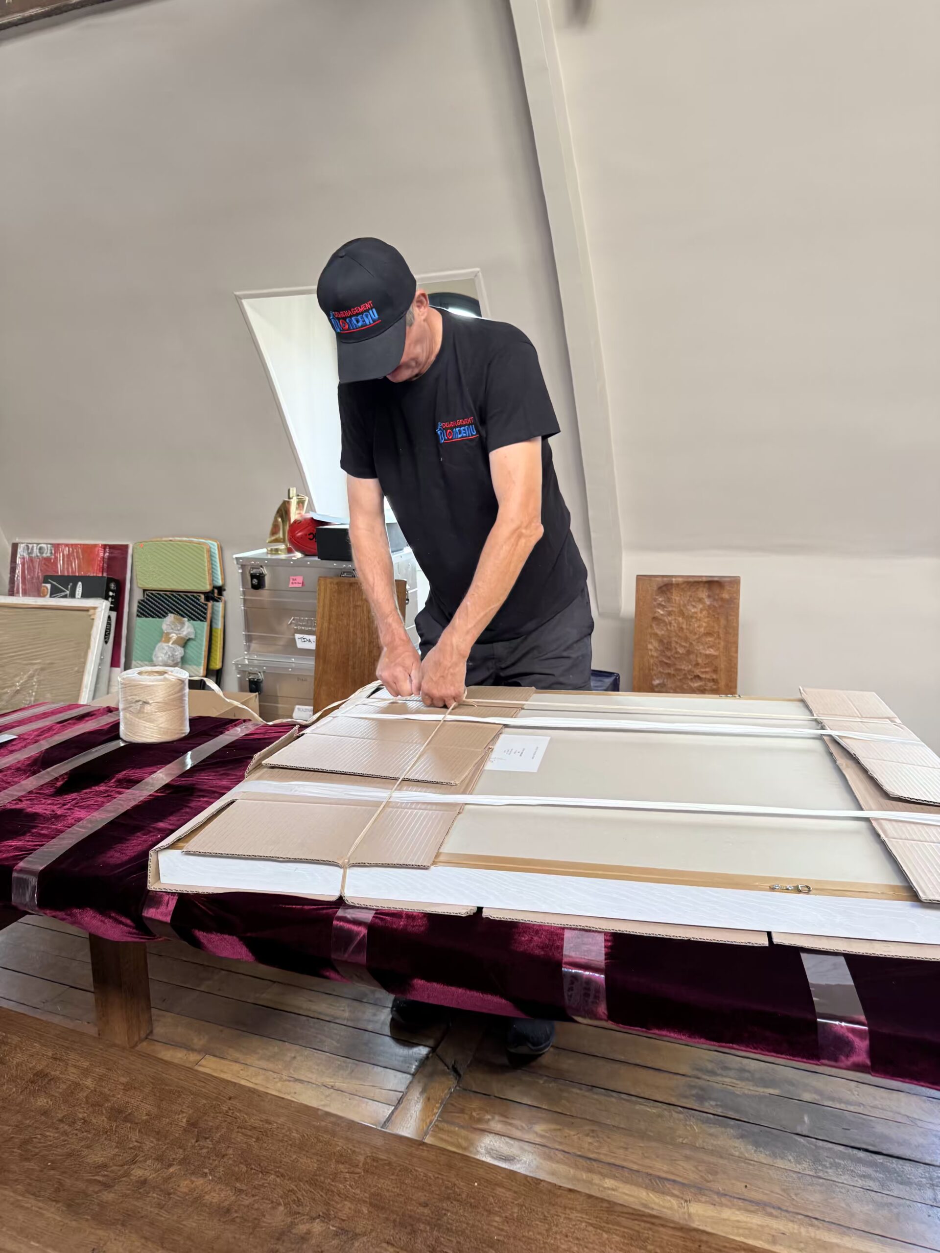 Temps d'emballage moyen : 15 minutes pour un tableau 60x80cm, 30 minutes pour un tableau 120x150cm, 60 minutes pour une œuvre monumentale >2m ou un triptyque. La précision prime sur la rapidité.