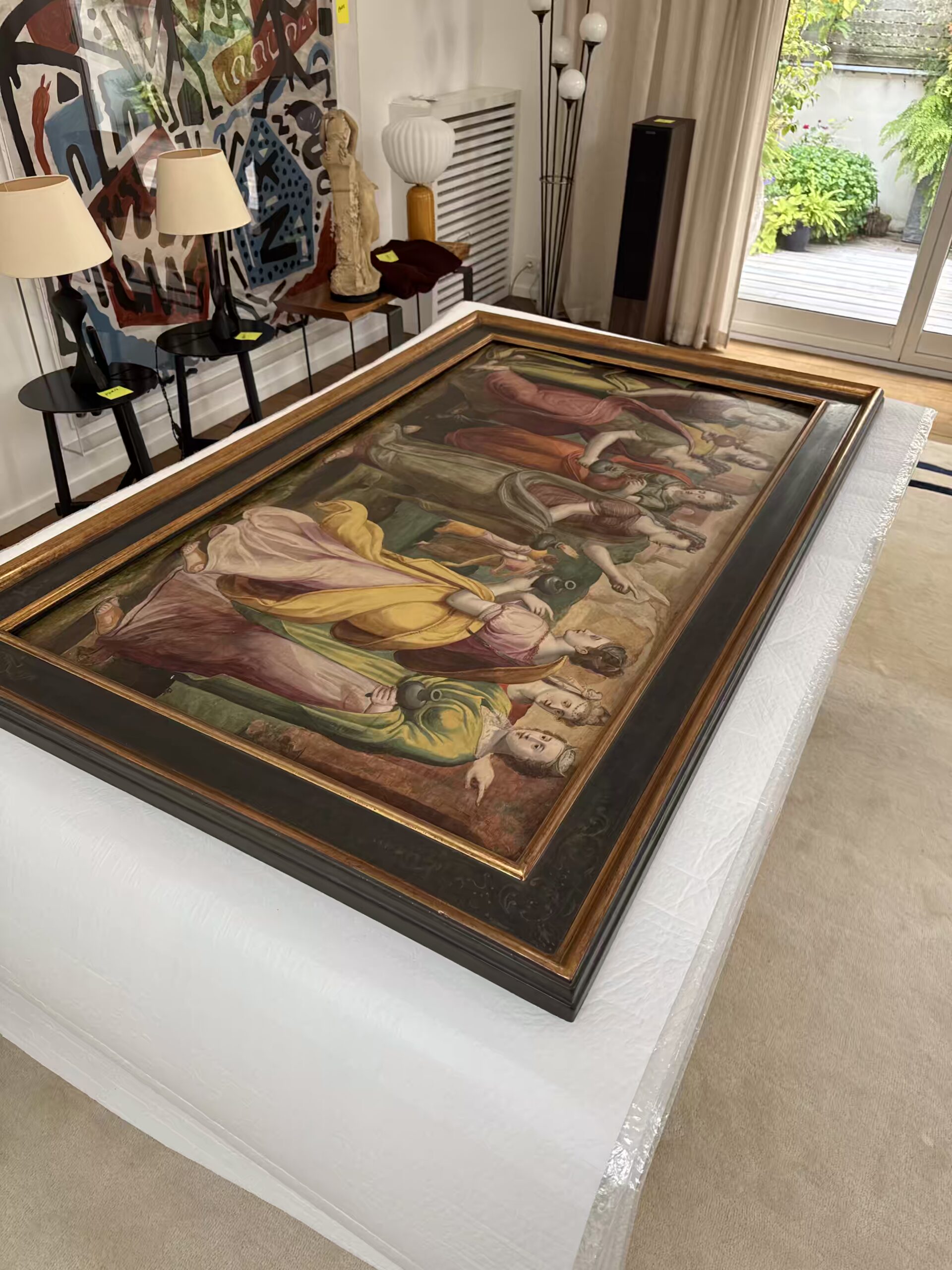 Avant toute manipulation, nous effectuons une inspection visuelle complète de l'œuvre. Nous photographions le tableau sous plusieurs angles en haute résolution pour documenter son état initial. Nous notons la présence de craquelures, soulèvements de peinture, cadre abîmé, ou tout autre détail. Cette documentation protège le client et le déménageur en cas de litige. Pour les œuvres de plus de 50 000€, nous recommandons un constat d'état par un restaurateur certifié.