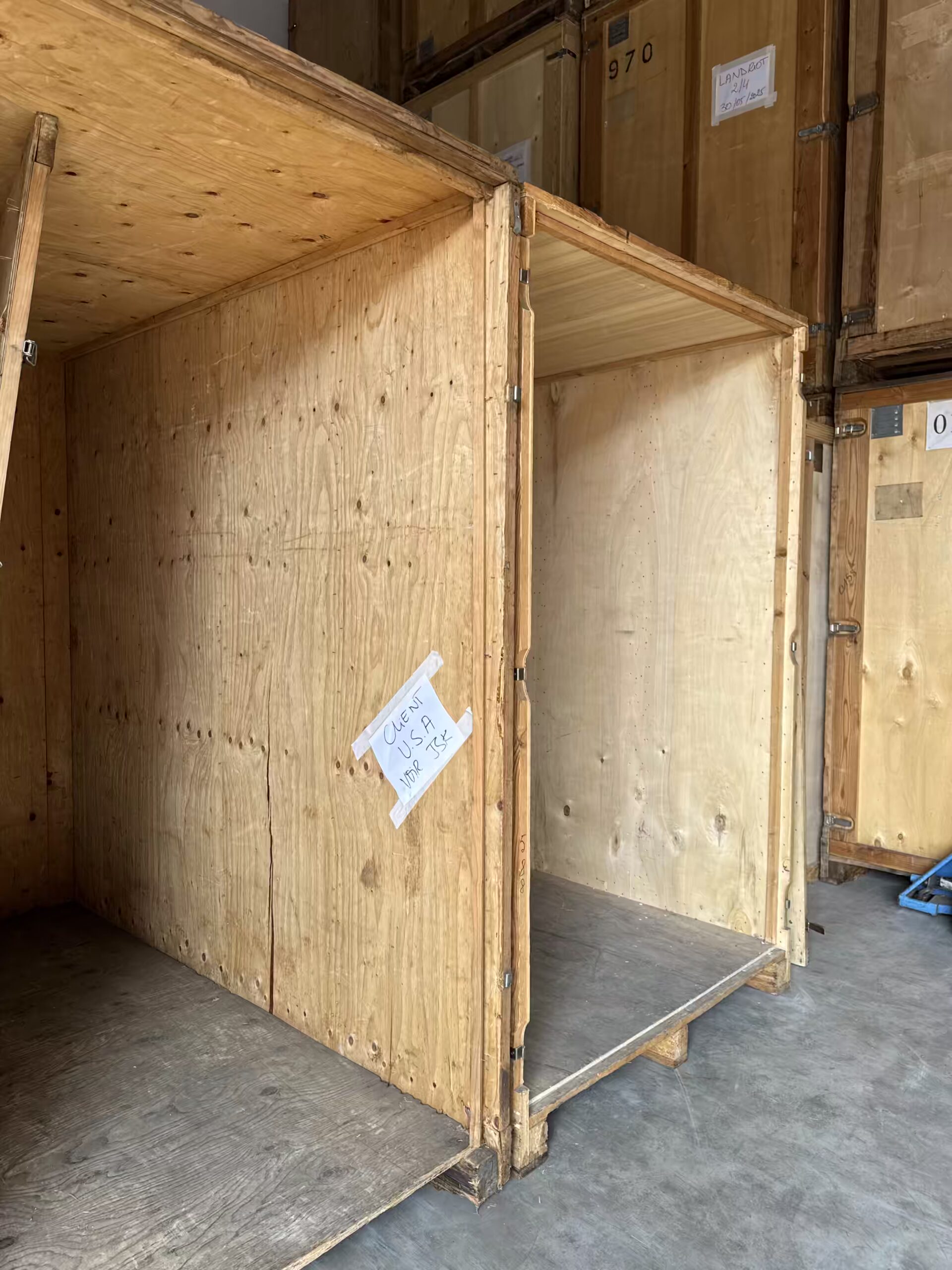Conception de caisses individuelles adaptées aux dimensions exactes de chaque œuvre. Utilisation exclusive de matériaux pH neutre : bois massif FSC, carton acide-free, mousse polyéthylène, voile de protection antistatique. Pour tableaux : cadres de protection avec coins renforcés. Pour sculptures : calage sur-mesure absorbant chocs. Scellement avec plombs numérotés traçables.