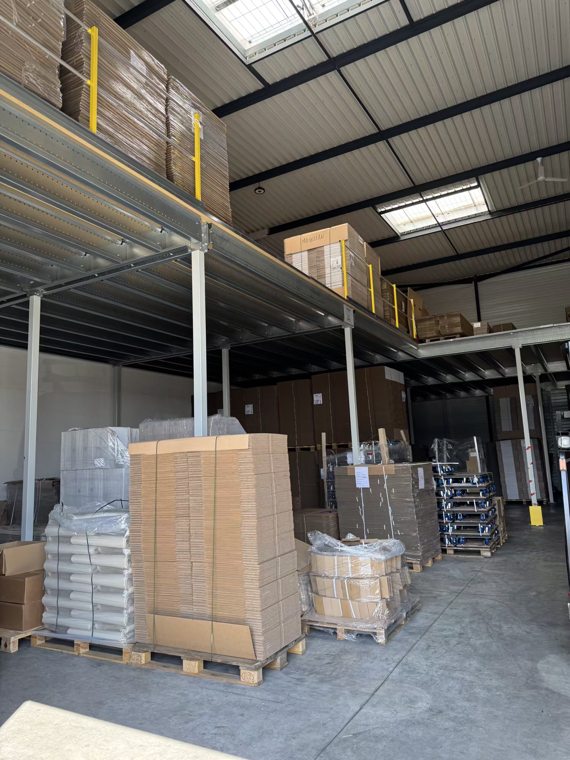 Entrepôt sécurisé avec vidéosurveillance permanente, alarme anti-intrusion, rondes quotidiennes, contrôle accès biométrique.